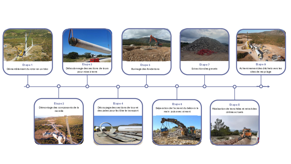 •Le démantèlement des éoliennes, des postes de livraison ainsi que des câbles électriques dans un rayon de 10m autour des éoliennes et des postes de livraison.